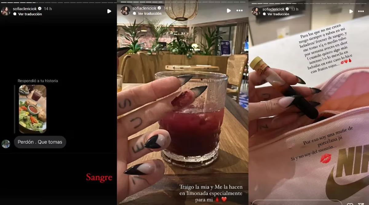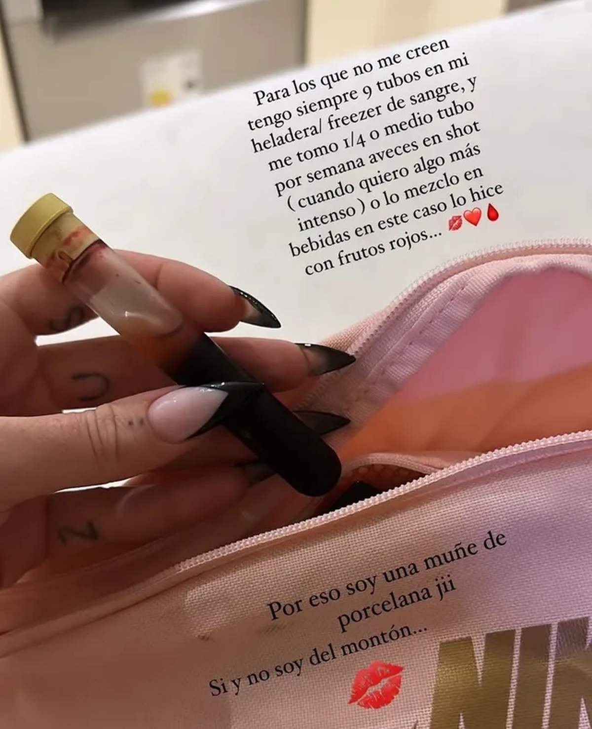Incluso, Clerici mostró en una historia de Instagram un tubo de laboratorio bioquímico que ella tenía en su bolso y que tenía sangre humana (se supone) en su interior. La exnovia de Martín Insaurralde contó que tomar sangre la hace verse como una "muñeca de porcelana".