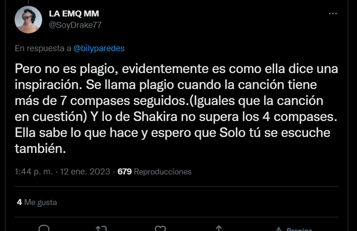 Lo cierto es que ambos estribillos suenan iguales, a pesar de que el resto de la letra sea diferente. “Si mi canción fue utilizada como sample o como inspiración de alguna manera, me gustaría al menos recibir el crédito. Para mí vale demasiado. Si me hubiesen preguntado ‘mira, queremos una partecita de tu canción para Shakira’ les hubiese dicho que 'claro'", expresó.