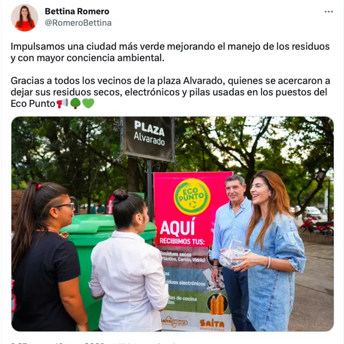 Horas antes del reencuentro de Marcos con su padre, la intendenta de Salta, Bettina Romero, posteó en sus redes una imagen junto a José Ginocchio contando que están trabajando "en una ciudad más verde y de mayor conciencia ambiental".