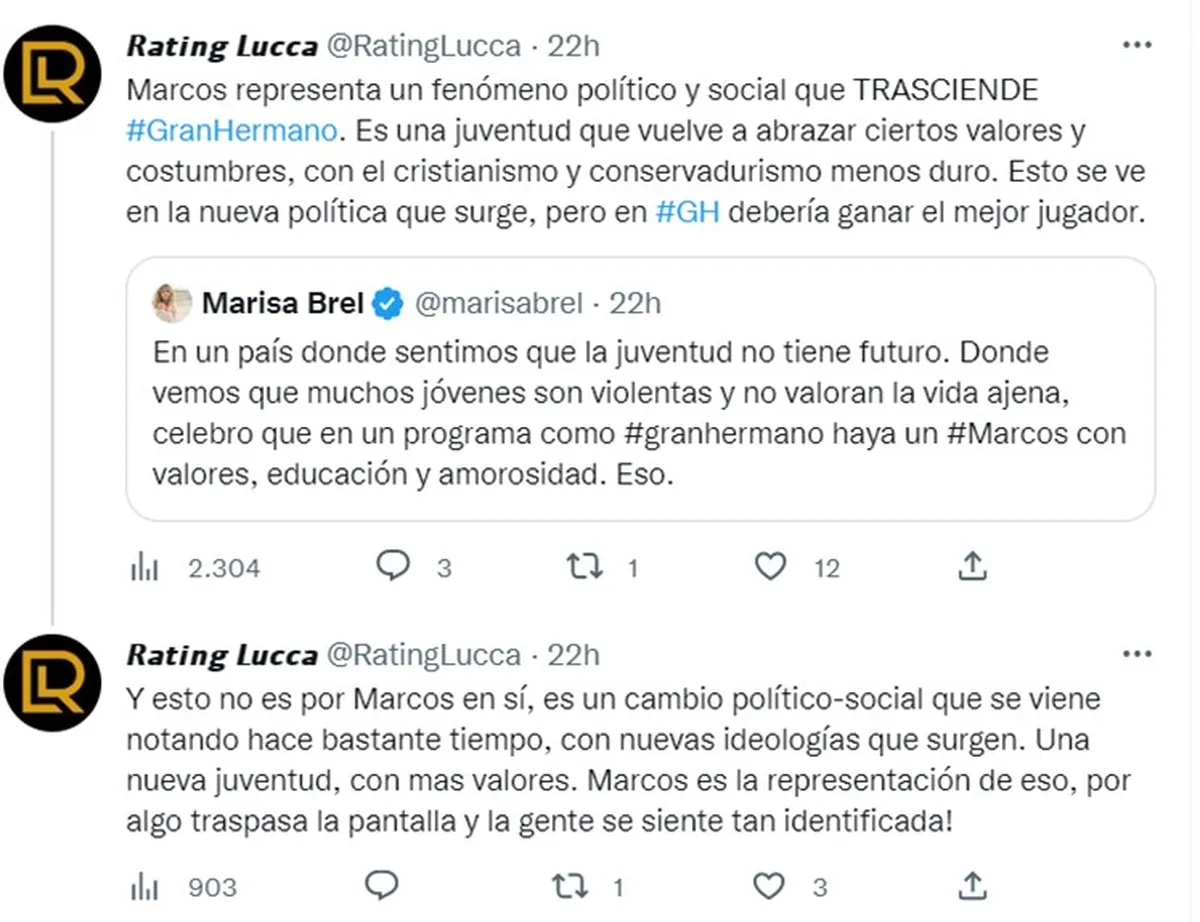 Sin dudas, el nombre más resuena en las redes como futuro ganador es el de Marcos Ginocchio. Desde el minuto uno que ingresó en la casa el joven salteño mostró un perfil conservador, apegado a su familia, estudioso, de personalidad calma y respetuosa, manifestando su ferviente fe y ajeno al conflicto.