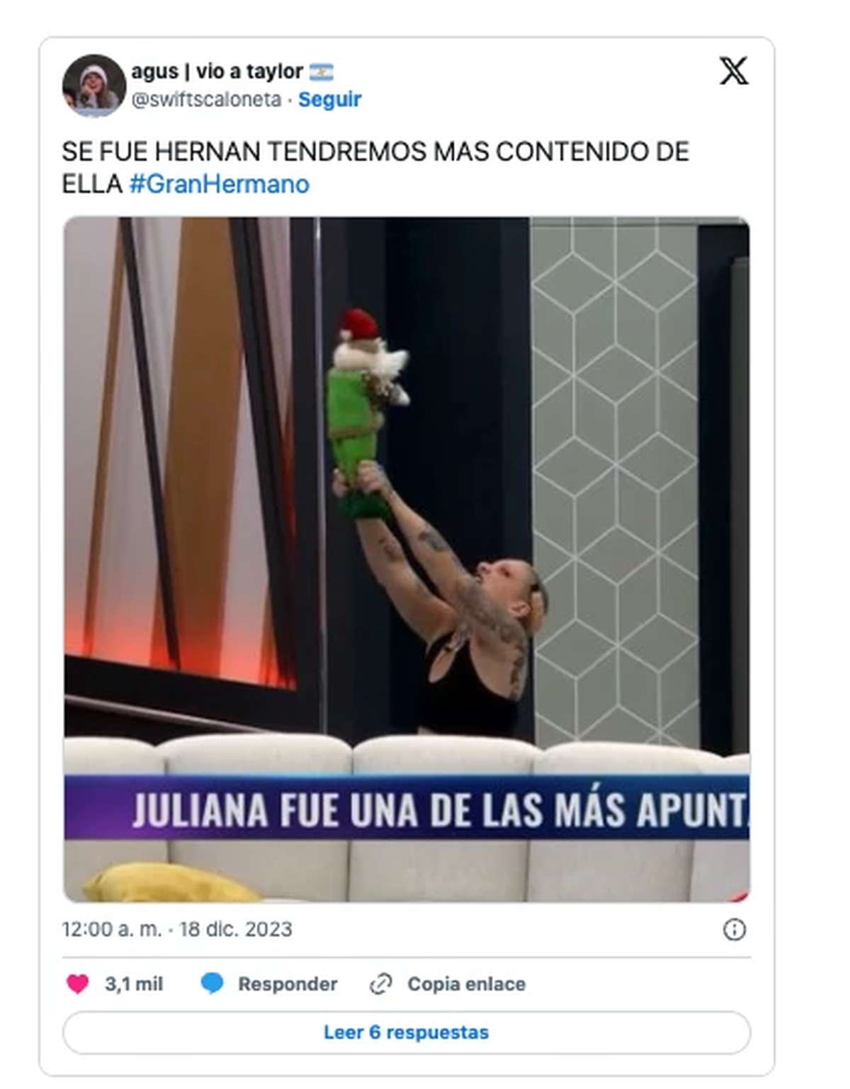 En un mano a mano entre Hernán y 'Furia', tras la salida de la placa de Zoe Bogach con el 10,6 por ciento de los votos y el correntino William López con el 6,76, el público decidió que la filosa Juliana se quede en la Casa de GH, para sorpresa de sus compañeros. Fue inesperado incluso para Hernán, que no había hecho sus valijas porque confiaba en que no sería eliminado.