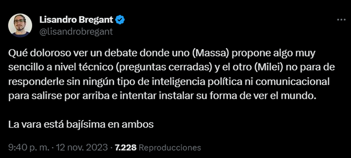 "Qué doloroso ver un debate donde uno (Massa) propone algo muy sencillo a nivel técnico (preguntas cerradas) y el otro (Milei) no para de responderle sin ningún tipo de inteligencia política ni comunicacional para salirse por arriba e intentar instalar su forma de ver el mundo. La vara está bajísima en ambos".