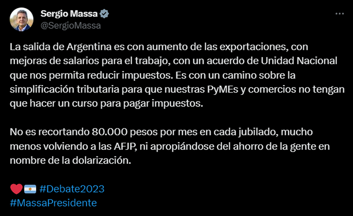 En este caso, al menos durante el debate presidencial, la cuenta que estuvo más activa fue la del candidato de Unidos por la Patria, Sergio Massa. Acá un ejemplo al respecto: