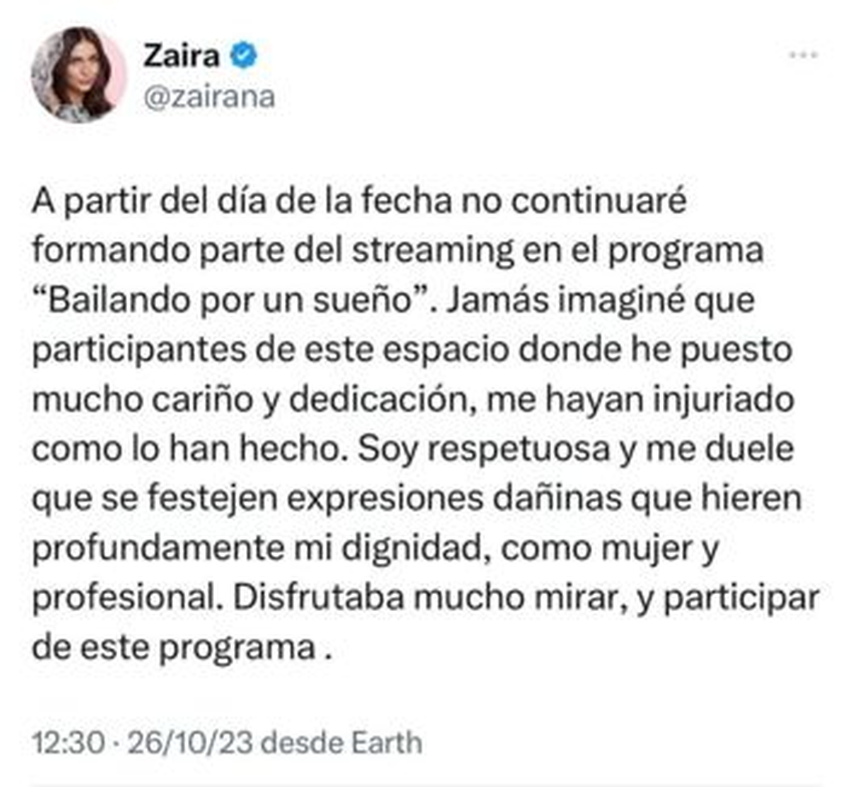 “ Dijo que se hicieron famosas por chupar pitos ”, disparó la correntina. Al trascender, Zaira Nara se comunicó con la producción y les avisó que abandonaría el reality show tras que Marcelo Tinelli no "les pusiera un límite a los daños morales ocasionados".