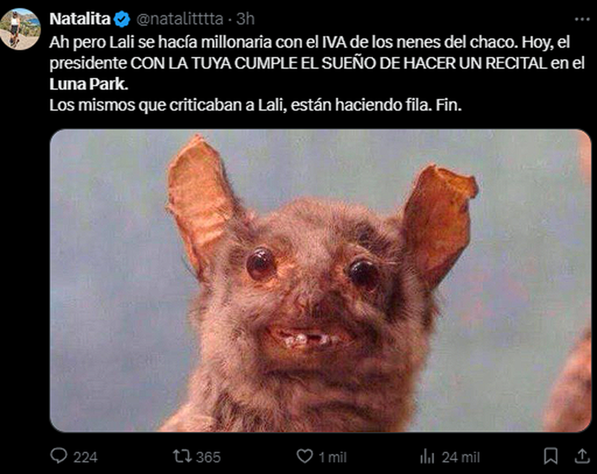"Ah pero Lali se hacía millonaria con el IVA de los nenes del chaco. Hoy, el presidente CON LA TUYA CUMPLE EL SUEÑO DE HACER UN RECITAL en el Luna Park. Los mismos que criticaban a Lali, están haciendo fila. Fin".