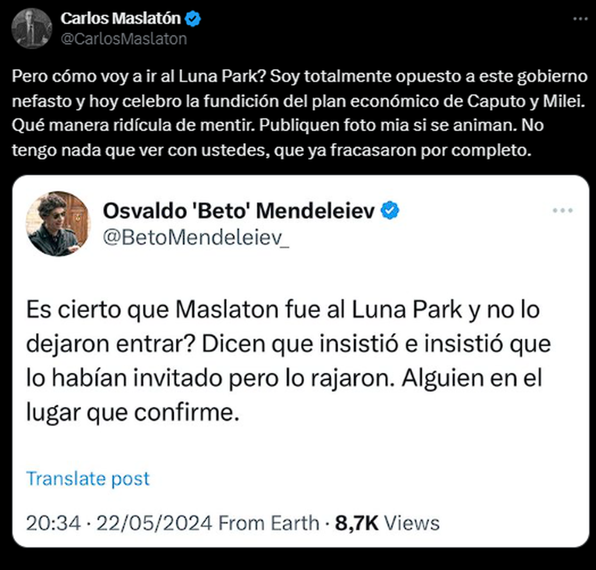 "¿Pero cómo voy a ir al Luna Park? Soy totalmente opuesto a este gobierno nefasto y hoy celebro la fundición del plan económico de Caputo y Milei. Qué manera ridícula de mentir. Publiquen foto mía si se animan. No tengo nada que ver con ustedes, que ya fracasaron por completo".