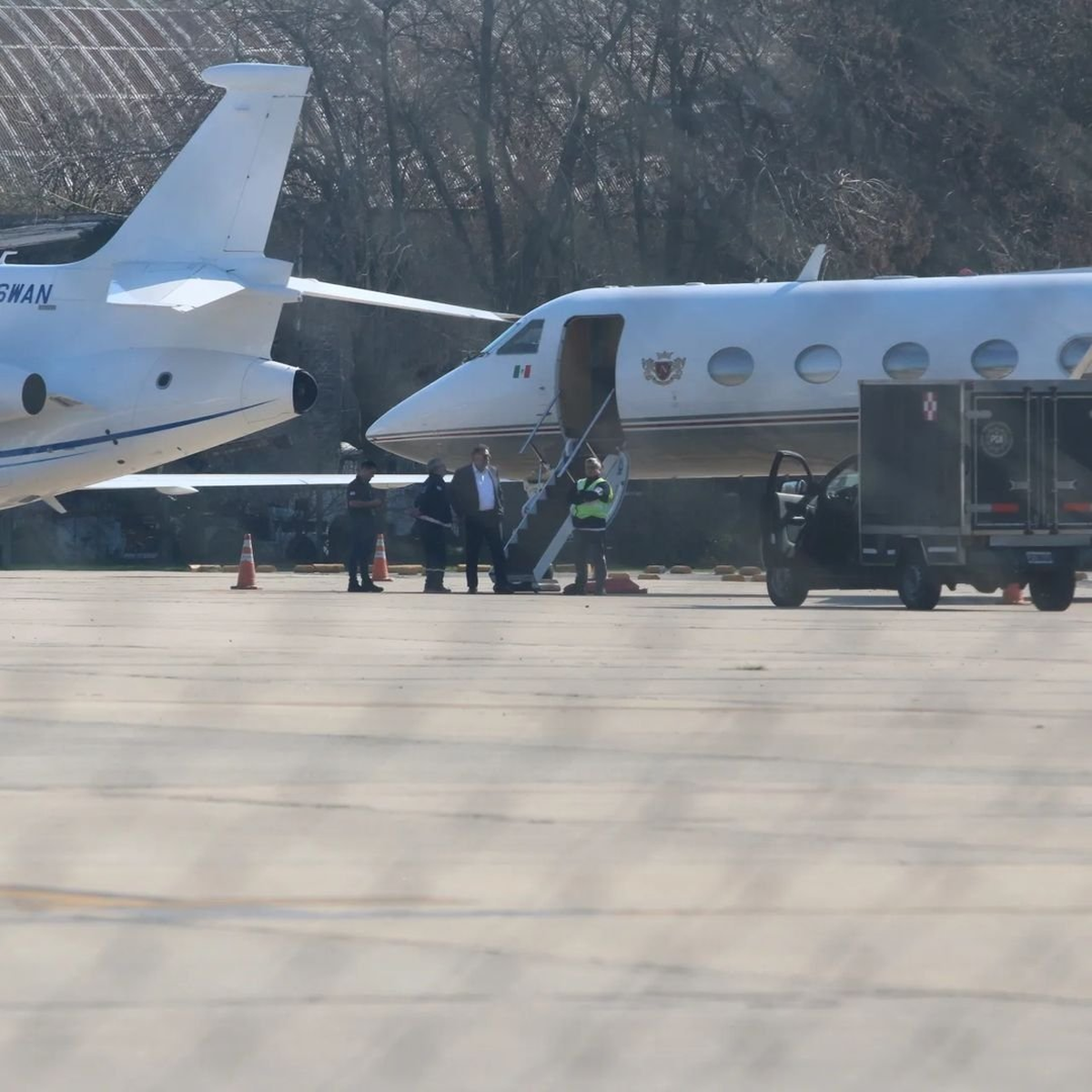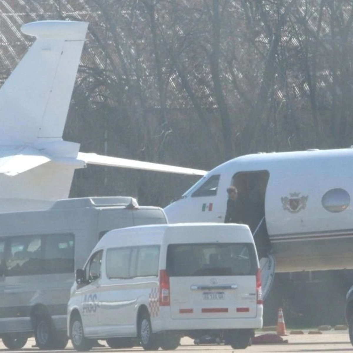Con un look "total black" y anteojos de sol, se lo pudo ver sonriente bajando de su avión privado. El Sol se llevó todas las miradas tras su drástico cambio físico.
