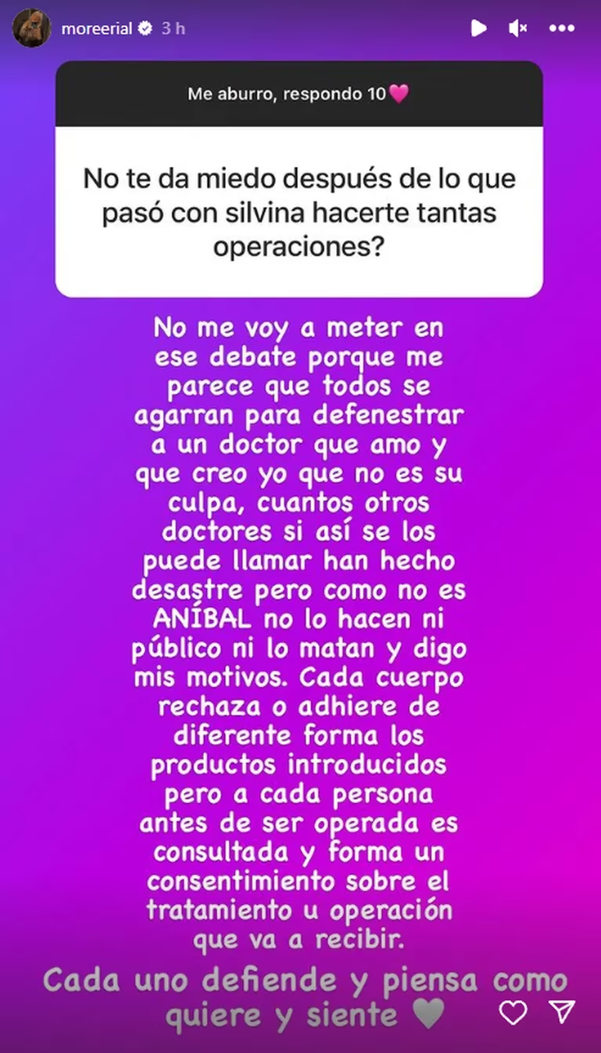 Tras el trágico fallecimiento de Silvina Luna y Mariano Caprarola, se generaron diversas opiniones acerca de Aníbal Lotocki, el cirujano responsable de las intervenciones estéticas que resultaron en problemas de salud para ambos. No obstante, así como un gran número de personas se alzó en defensa de las reconocidas figuras, también se encontraron quienes brindaron su respaldo al mencionado médico. Entre los cuales, se destaca la voz de Morena Rial, quien, a raíz de una pregunta formulada en su cuenta de Instagram, no dudó en expresar su punto de vista con respecto a este tema tan delicado.