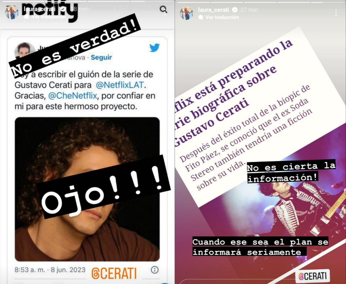 "No es verdad, ojo”, expresó Laura Cerati, hermana del cantante, en una historia de Instagram, refiriéndose a los rumores que se propagaron en las plataformas digitales acerca de una posible creación audiovisual sobre el músico. Asimismo, añadió: "cuando ese sea el plan se informará seriamente".