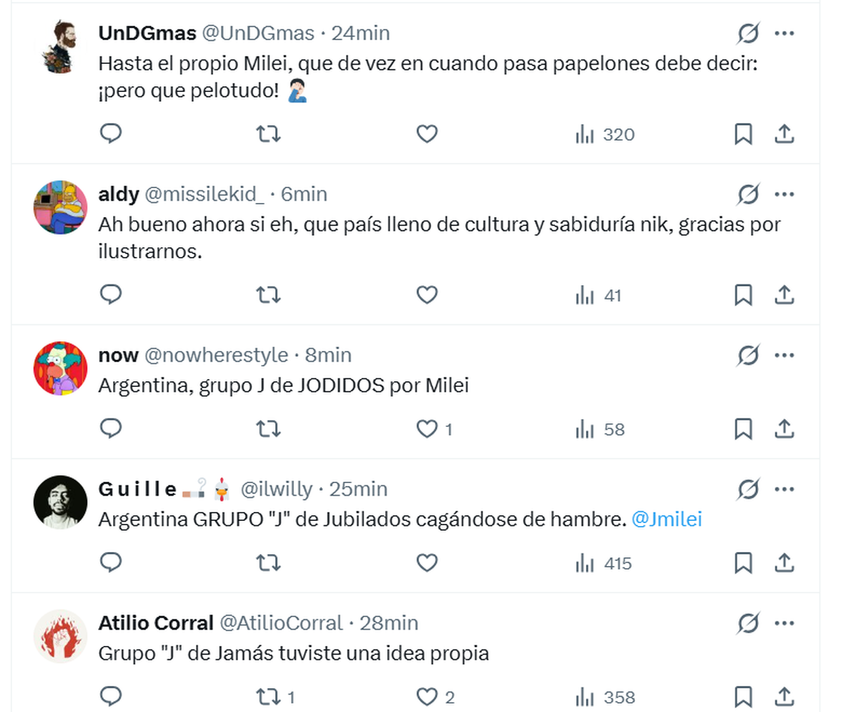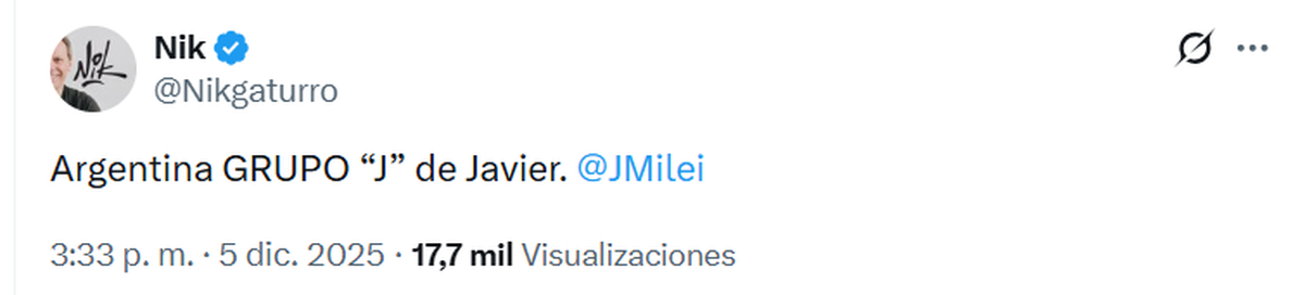 Tras el sorteo del Mundial 2026, Nik escribió en su cuenta de X: "Argentina GRUPO 'J' de Javier", en referencia al grupo que le tocó a la Selección nacional. Como si fuera poco, arrobó a Javier Milei para que vea su mensaje (y, en lo posible, lo retuitee, como hace con muchos de sus posteos mileístas).