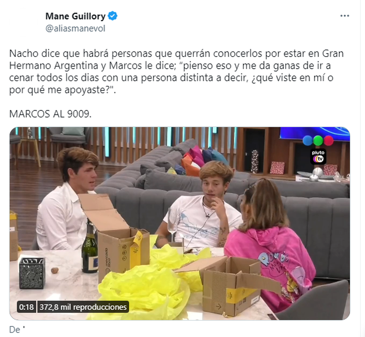 "Nacho dice que habrá personas que querrán conocerlos por estar en Gran Hermano Argentina y Marcos le dice; “pienso eso y me da ganas de ir a cenar todos los dias con una persona distinta a decir, ¿qué viste en mí o por qué me apoyaste?". MARCOS AL 9009."