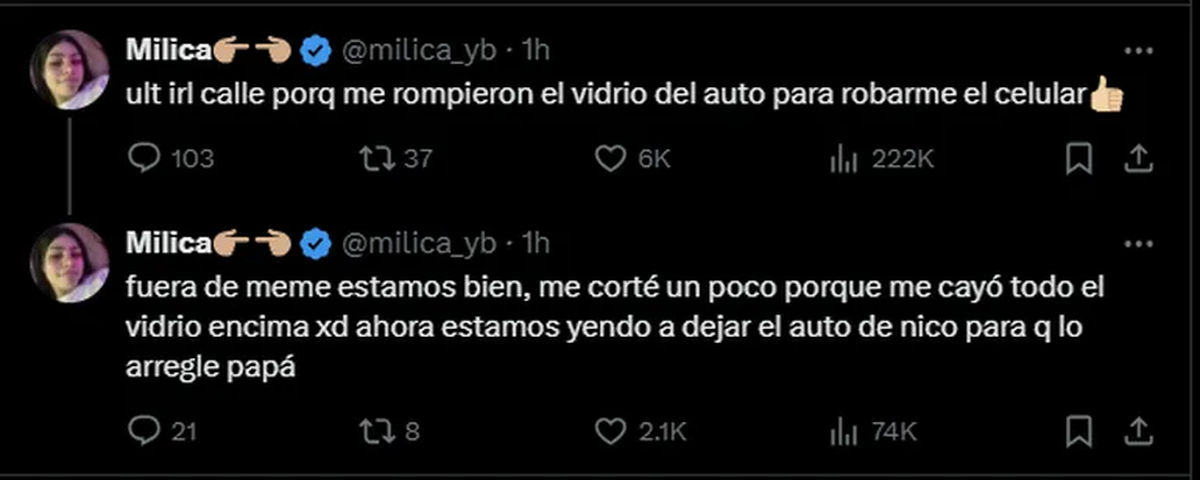 Milica, visiblemente afectada, pero resiliente, compartió brevemente su experiencia en la plataforma X: "Ult irl calle porque me rompieron el vidrio del auto para robarme el celular", revelando la cruda realidad de un momento que quedará grabado en la memoria de sus seguidores.