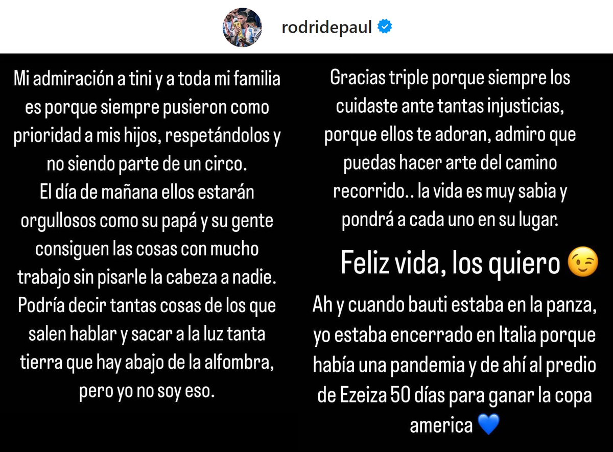 Mientras que pareciera ser que Stoessel continúa con su vida, habiendo vuelto a cantar y retomando la actuación, Rodrigo De Paul no se olvida de ella y no deja de enviarle indirectas. Llama la atención la insistencia del jugador dado que la cantante se muestra alejada de él, sin responder a ninguno de sus intentos públicos de acercamiento.