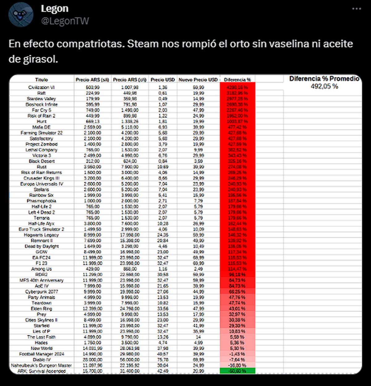 Un usuario de la red social X, antes conocida como Twitter, compartió ejemplos de los aumentos, que varían desde el 1% hasta el 4.000%. Por ejemplo, el juego EA FC24, que tenía un precio en pesos argentinos de 29.998, ahora se cotiza en 69,99 dólares, representando un aumento del 115,53%. Otro caso extremo es el del juego Among Us, que pasó de costar 7,99 pesos a 4,99 dólares, lo que implica un salto del 4.000%.