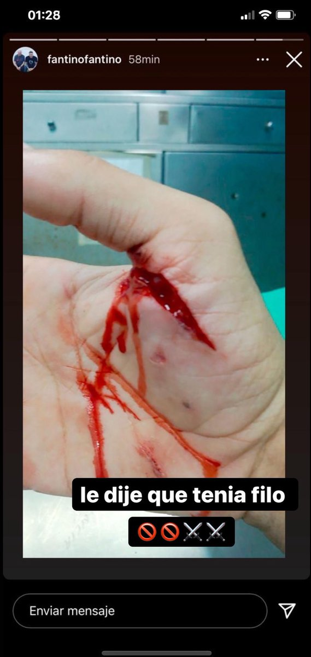 Pasado el programa, Fantino compartió en sus historias de Instagram la foto de una mano con un profundo tajo. Junto a la imagen de la herida escribió: “Le dije que tenía filo”, haciendo referencia a las armas vistas en la entrevista.
