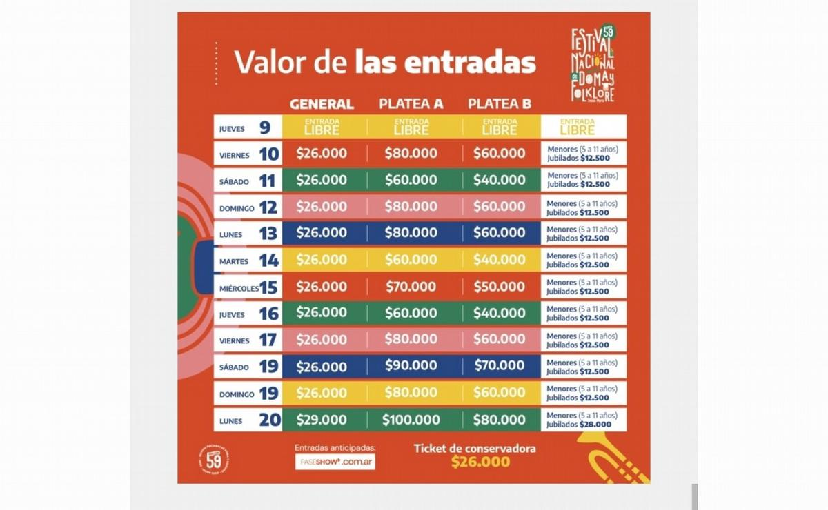 Por último, el domingo 19 tocarán Los Palmeras; El Loco Amato; Los Trajinantes; La Clave Trío. Mientras que el cierre del lunes 20 estará a cargo de Luck Ra; Diego Torres; MYA; Valentino Merlo.