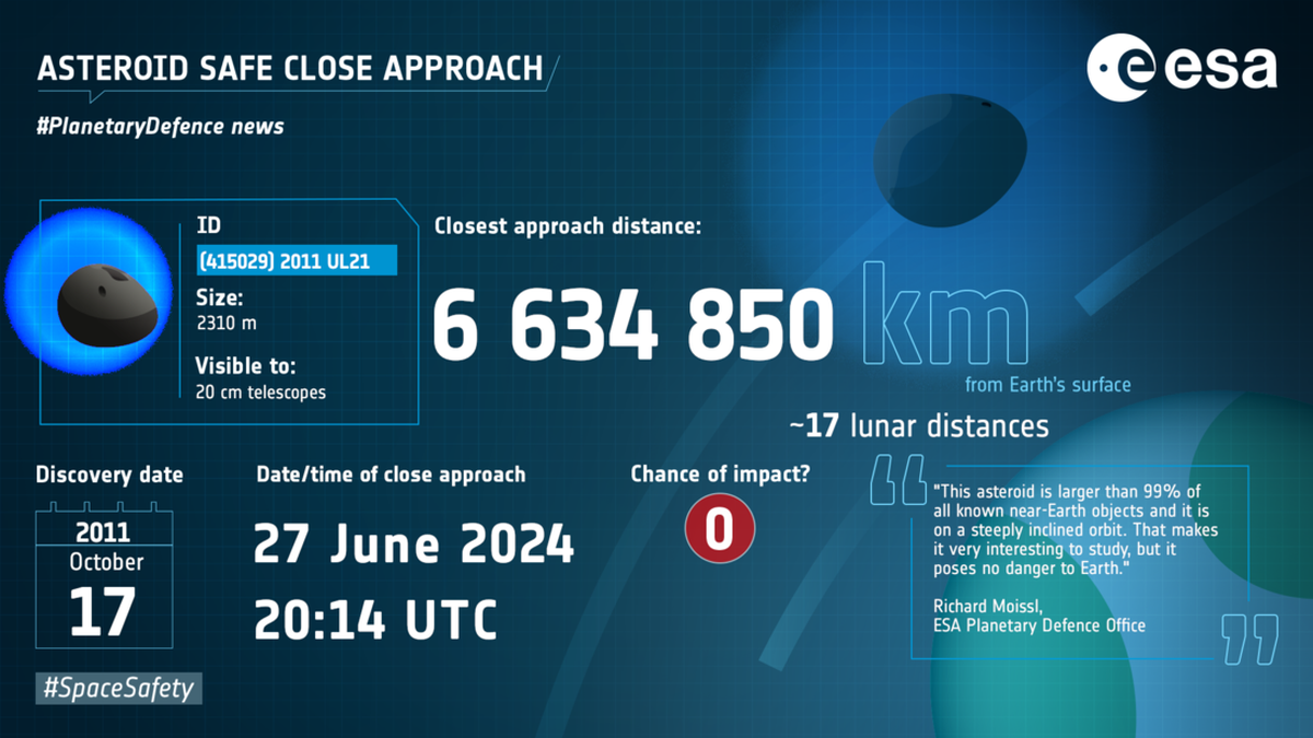 “Este asteroide es más grande que el 99 por ciento de todos los objetos cercanos a la Tierra conocidos”, explicó la Agencia Espacial Europea a través de un comunicado. “Sin embargo, no se acercará tanto a la Tierra. En su punto más cercano, el 27 de junio, seguirá estando más de 17 veces más lejos que la Luna”, agregó.