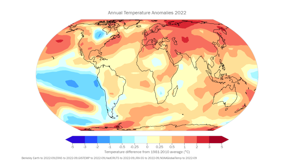 El informe a cargo de la Organización Meteorológica Mundial (OMM) de las Naciones Unidas detalló el aumento de la temperatura media del planeta: en el 2022 fue de 1,15 °C, siendo más cálida incluso que la de la época pre-industrial. A pesar del enfriamiento por el fenómeno meteorológico La Niña a nivel mundial, estos últimos ocho años fueron los más cálidos registrados.