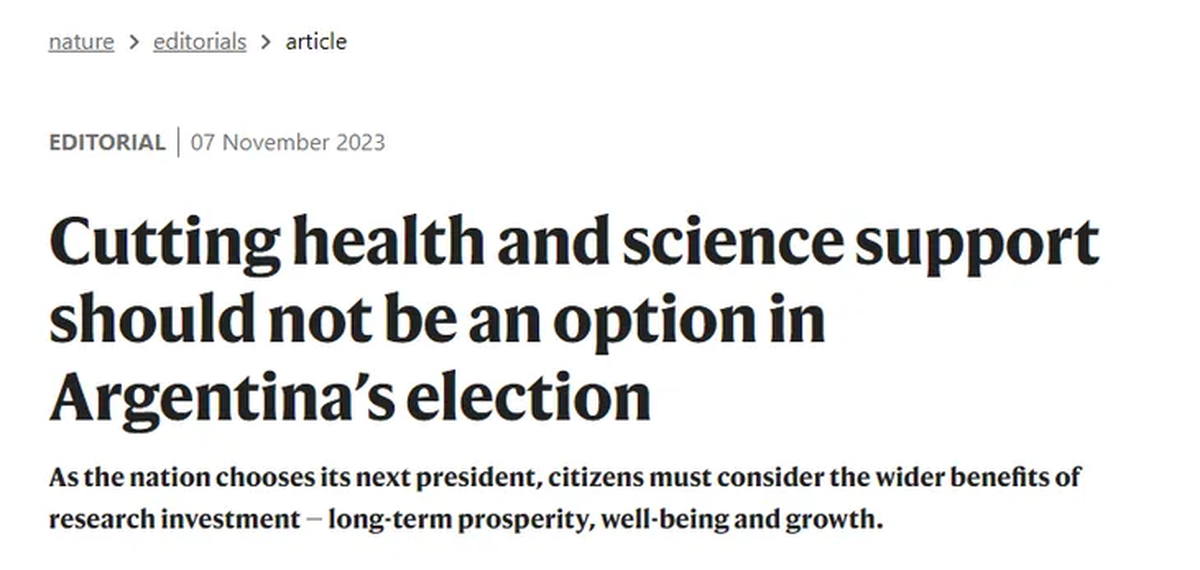 Lo hizo a solo dos semanas del balotaje, en un editorial, en contra del candidato presidencial de La Libertad Avanza, en el que advirtió que "la solución no es recortar la investigación y el desarrollo, y mucho menos abolir toda una agencia de financiación de la ciencia".