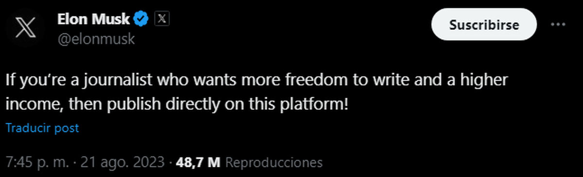 Musk, quien compró la plataforma en octubre pasado, notó el cambio al responder a la publicación de un usuario sobre el tema. “Si eres un periodista que quiere más libertad para escribir y mayores ingresos, ¡entonces publica directamente en esta plataforma!”, escribió Musk en X.