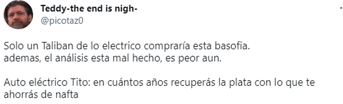 "Solo un Talibán de lo eléctrico compraría esta bazofia. Además, el análisis está mal hecho, es peor aún. Auto eléctrico Tito: en cuántos años recuperas la plata con lo que te ahorras de nafta."