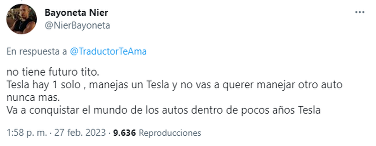 "No tiene futuro tito. Tesla hay 1 solo , manejas un Tesla y no vas a querer manejar otro auto nunca mas. Va a conquistar el mundo de los autos dentro de pocos años Tesla."