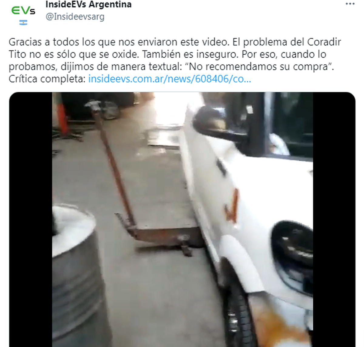 "Gracias a todos los que nos enviaron este video. El problema del Coradir Tito no es sólo que se oxide. También es inseguro. Por eso, cuando lo probamos, dijimos de manera textual: “No recomendamos su compra”."