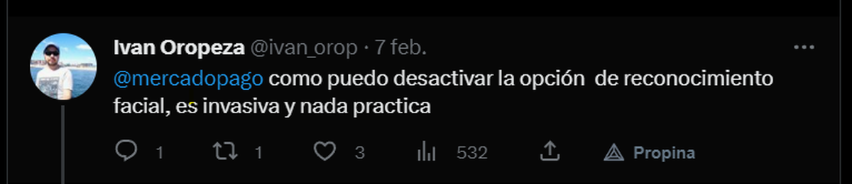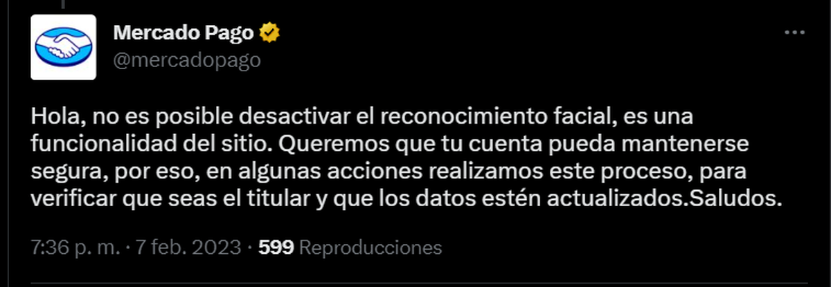 Ante las reiteradas quejas de los usuarios, la respuesta por parte de Mercado Pago fue que no es posible desactivar el reconocimiento facial ya que se trata de una funcionalidad del sitio.