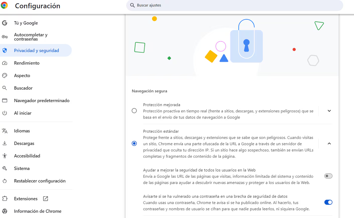- Buscar la sección "Privacidad y seguridad" y clickear donde dice "Protección estándar".