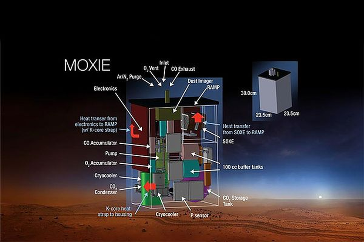 Para ello, utiliza un dispositivo no mayor que un microondas, llamado MOXIE, que quema periódicamente dióxido de carbono de la atmósfera marciana y lo convierte en oxígeno.