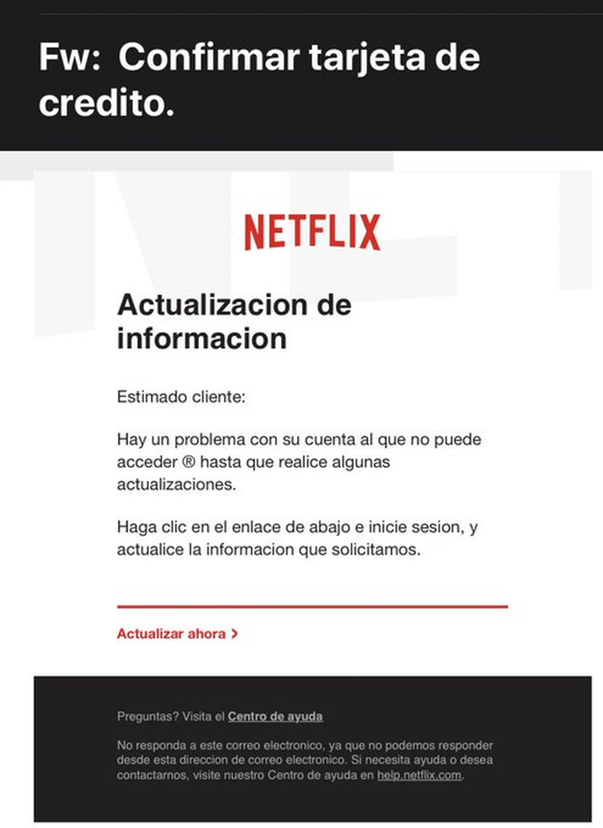 Las víctimas reciben un mail en nombre de Netflix que indica que existe algún tipo de problema con la cuenta o bien que se debe actualizar los datos personales y de la tarjeta mediante un enlace.