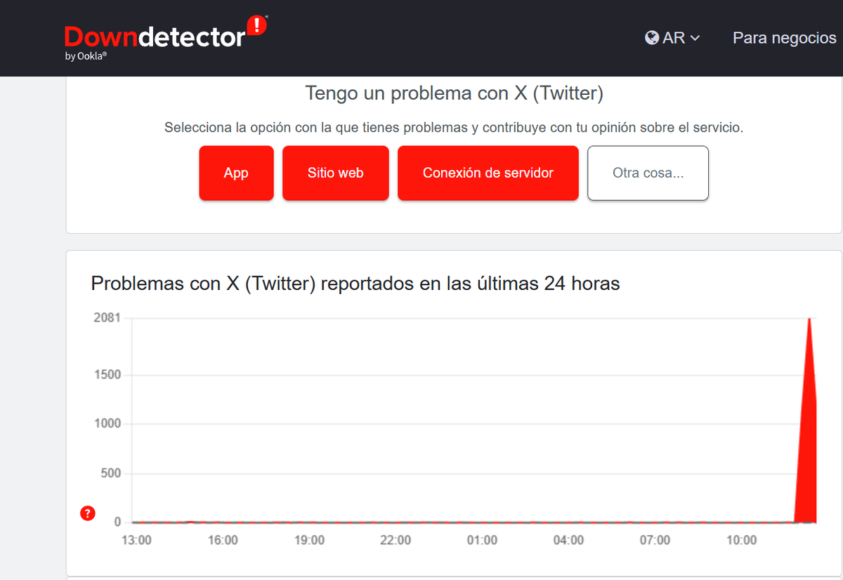 La red social empezaba a andar desde el martes 13/01 a la mañana, y en cuestión de minutos ya era evidente que la plataforma directamente no cargaba. Según Downdetector, el sitio que monitorea fallas a partir de reportes de usuarios, más de 2 mil personas en Argentina informaron problemas para acceder a X, mientras que en Estados Unidos la cifra alcanzó más de 20.300 personas. En el Reino Unido, las denuncias superaron los 8 mil, y en Canadá pasaron las 3.200.