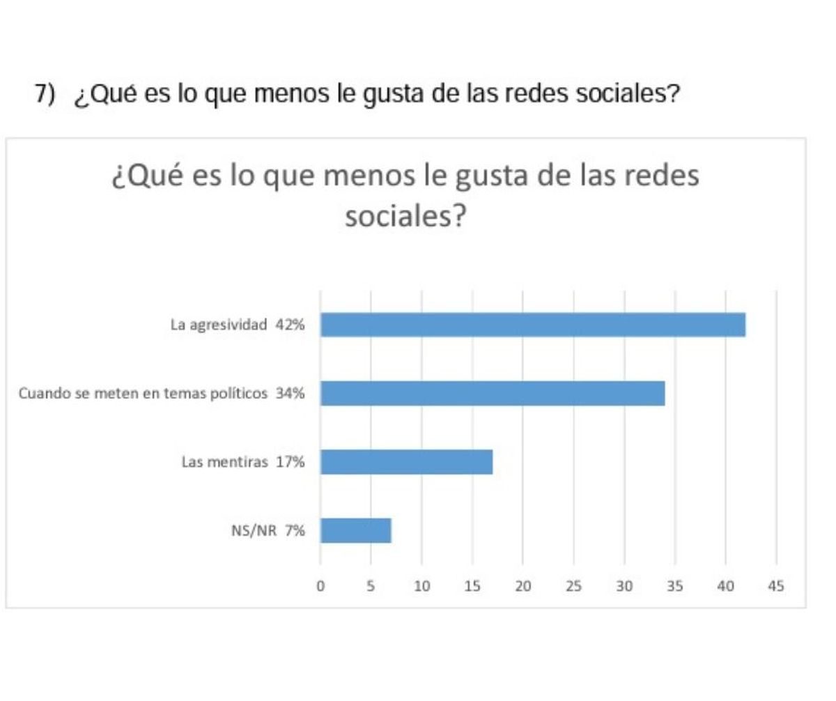 El 80% de los participantes del sondeo revela preocupación sobre las conductas de los jóvenes en estos ámbitos virtuales y, en particular, el tiempo que les dedican. Las cualidades negativas más impugnadas respecto de las redes sociales son la agresividad, con el 42%, y las mentiras, con el 17%.