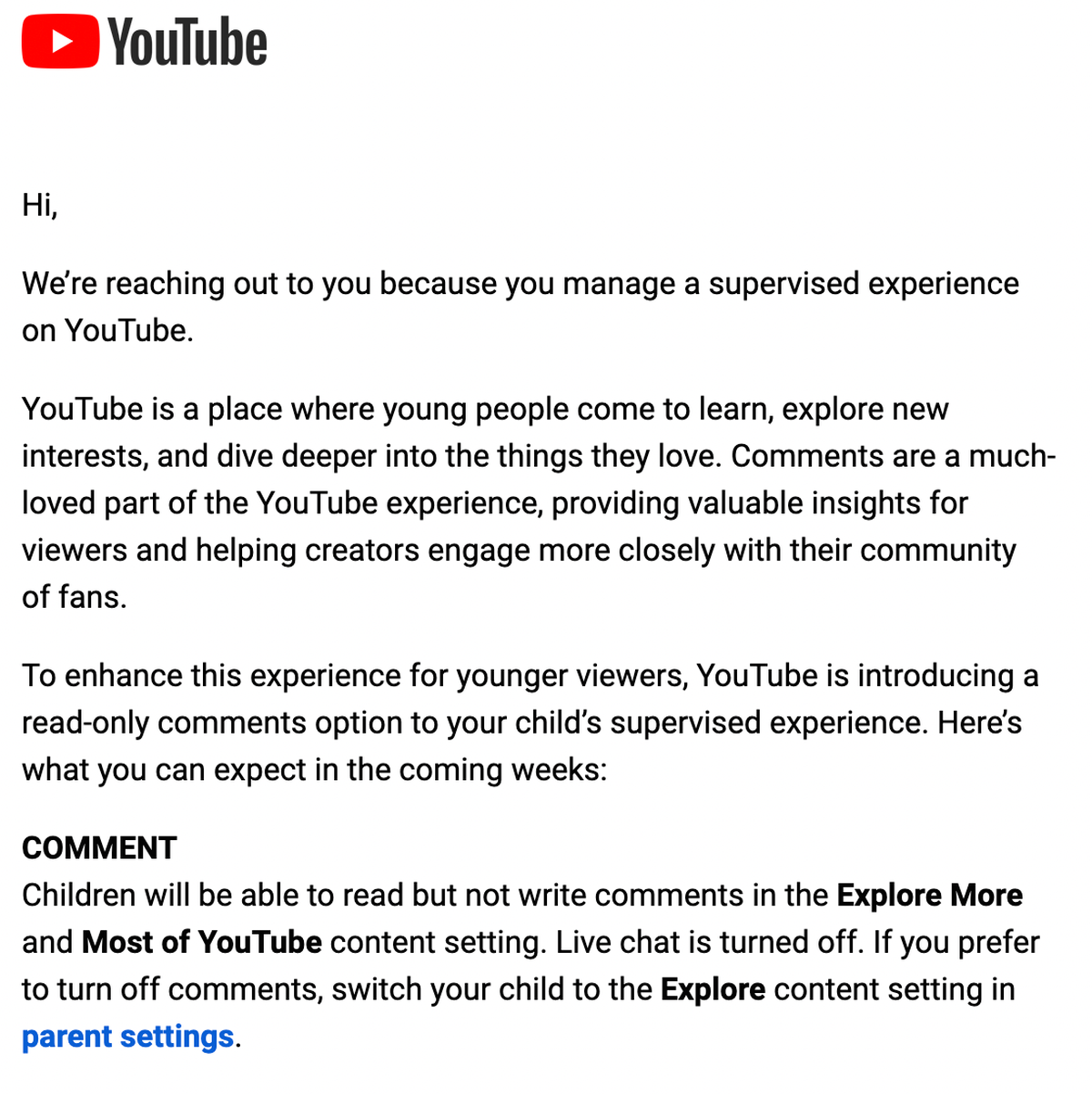 En un correo electrónico dirigido a los padres que supervisan la cuenta de sus hijos, YouTube anunció la introducción de una opción de "solo lectura" en la experiencia supervisada de los menores.
