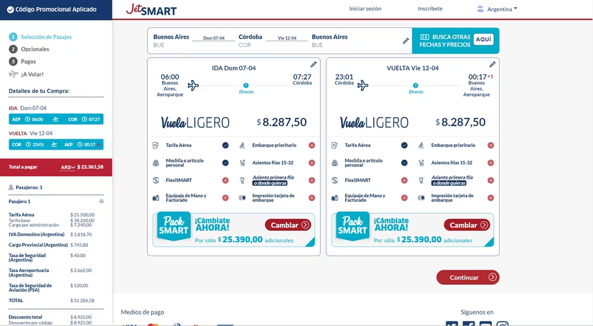Optando por viajar en abril, eligiendo el período del 7 al 12 con destino a Córdoba, el costo del vuelo asciende a $22.361,58. Cabe destacar que la tarifa no contempla la selección de asiento ni la posibilidad de añadir equipaje adicional.