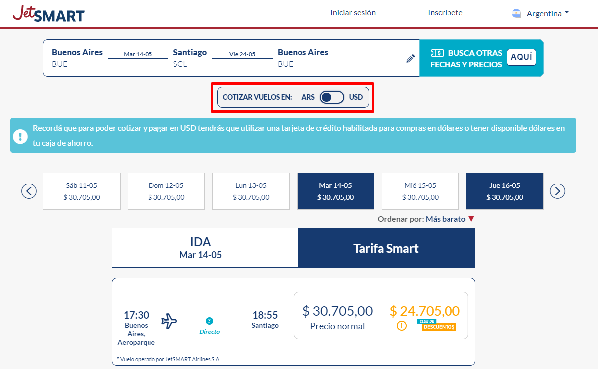 - Luego, a la hora de seleccionar la moneda en la que queremos cotizar el vuelo: peso argentino o dólar, se debe cambiar la cotización a dólares. Cabe aclarar que para hacer el pago en esta moneda, deberás revisar con tu banco si tu tarjeta de crédito está habilitada para pagos en dólares, si no es así, deberás saldar el monto en dólares al cierre de tu tarjeta de crédito personalmente en la sucursal del banco.