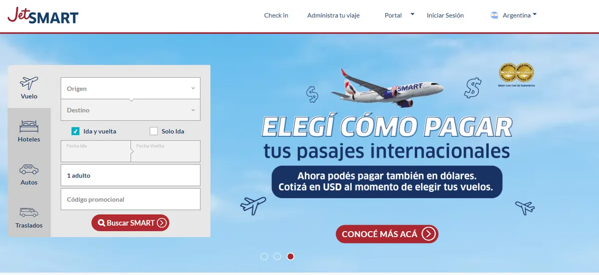- En primer lugar, se debe realizar la búsqueda en la web oficial (JetSmart.com) y seleccionar origen y destino. La low cost vuela entre Buenos Aires y 7 países: Brasil (Río- Florianópolis, San Pablo, Curitiba, Porto Alegre), Chile, Uruguay, Colombia, Ecuador, Perú y Paraguay.