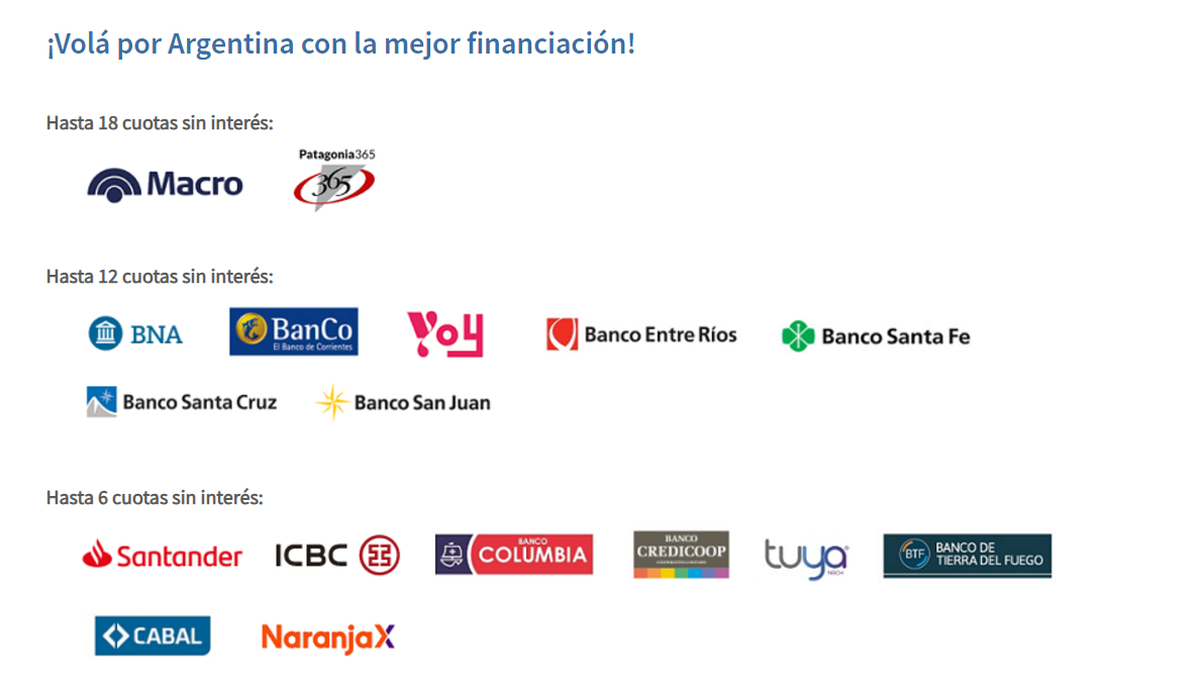 Aerolíneas, lanzó su "Aerolíneas Friday", hasta el 1° de diciembre. Según anunció el ministro de Turismo, Deporte y Ambiente, Daniel Scioli, habrá hasta 18 cuotas sin interés para viajar dentro de Argentina, con bancos y tarjetas seleccionadas.