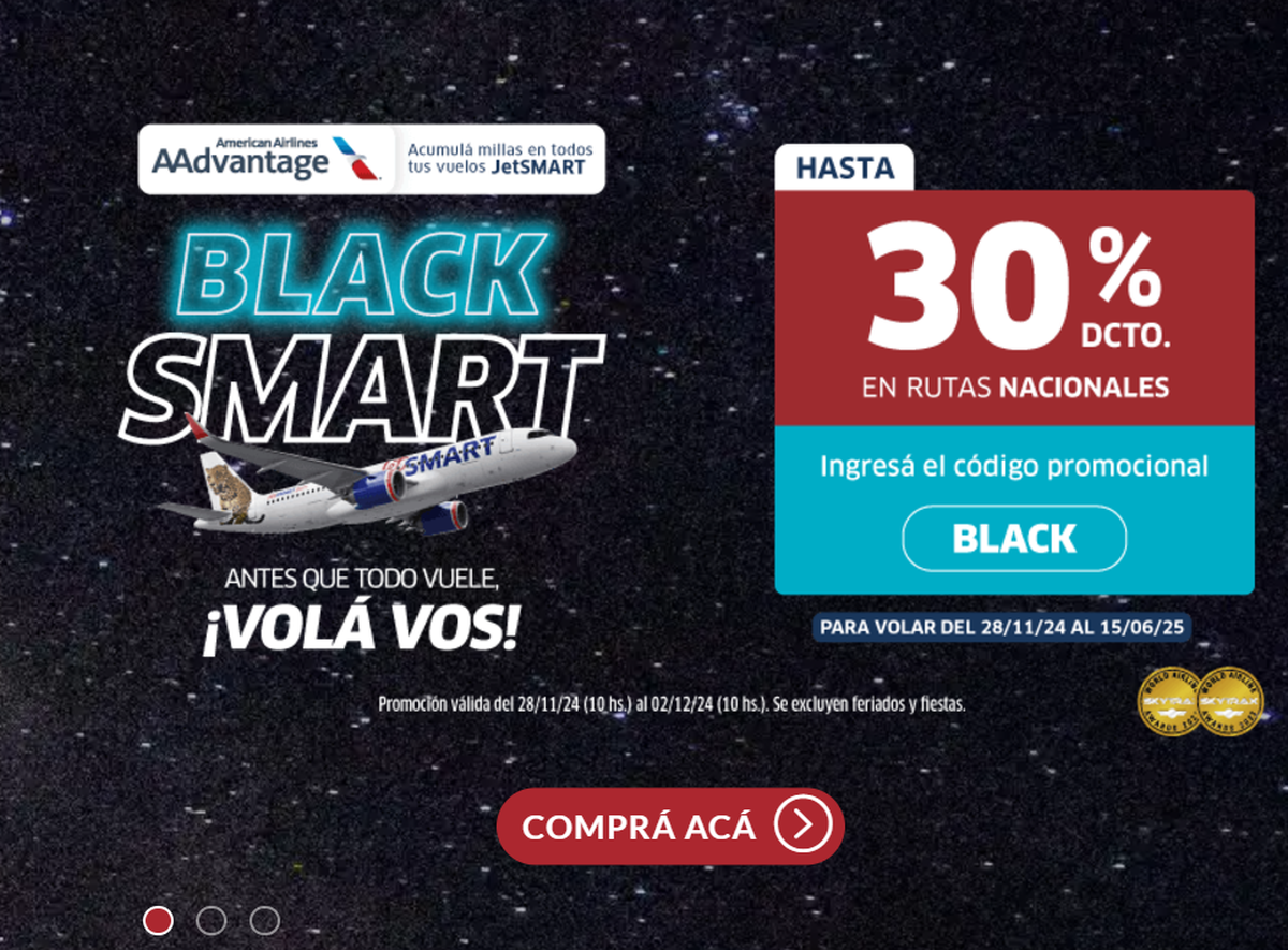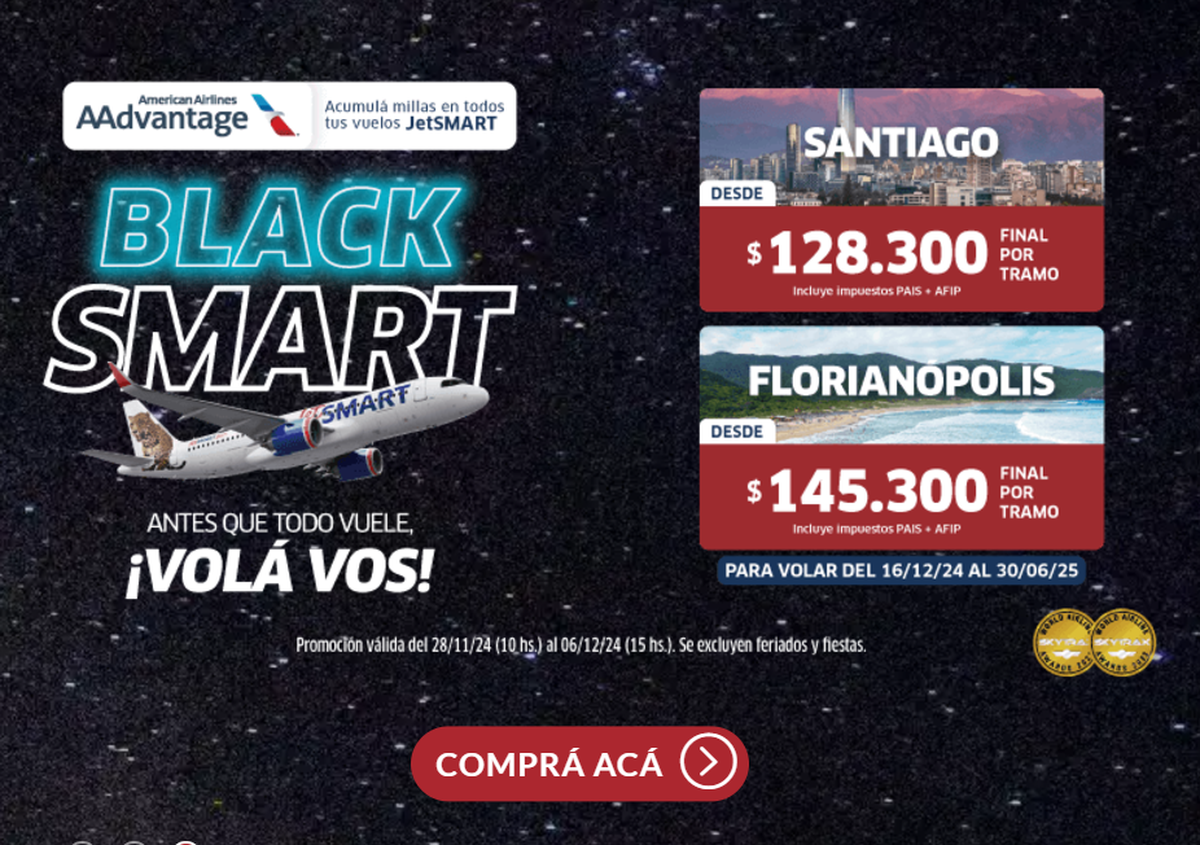 Para acceder a los descuentos se debe ingresar el código promocional BLACK, a través de la web de la low cost (JetSmart.com). Los pasajes en promoción servirán para volar dentro de las siguientes fechas: del 28/11 al 15 de junio de 2025.