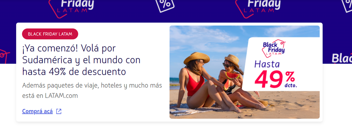 Latam, por su parte, ofrece 25% de descuento en millas Latam Pass. Además, hasta 40% de descuento por el "Black Friday LATAM" para viajar por Sudamérica.
