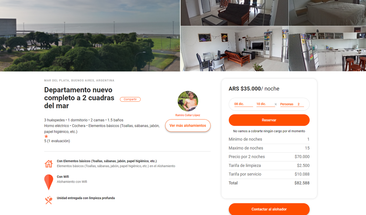 Por ejemplo, desde el viernes 08/12 al domingo 10/12, en Mar del Plata se consigue un departamento a estrenar a 2 cuadras del mar, para 3 huéspedes, con cochera, equipado, por $82.500. Cabe tener en cuenta que se trata de un pleno fin de semana largo de diciembre, por lo que cabe anticiparse para conseguir las mejores ofertas ya que los precios varían de acuerdo a las fechas.