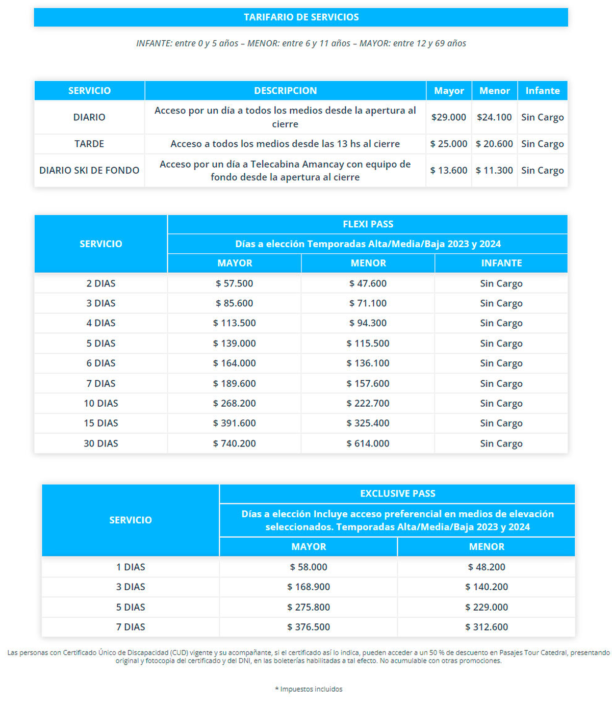 - El tour Catedral con ascenso por la Telecabina Amancay, Cable Carril u otros medios de elevación habilitados, el pasaje ida y vuelta cuesta $13.500 (mayores), $10.800 (menores) mientras que de 0 a 5 años acceden sin cargo.