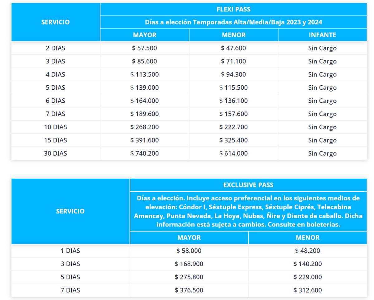 Hay tres opciones de pases. Los Pases Promocionales que tienen fecha determinada para usarlos o los FlexiPass / Exclusive Pass (con acceso preferencial en medios de elevación seleccionados), que son para utilizar días alternados o consecutivos, con fecha abierta, para usar durante la temporada 2023 y también la de 2024.
