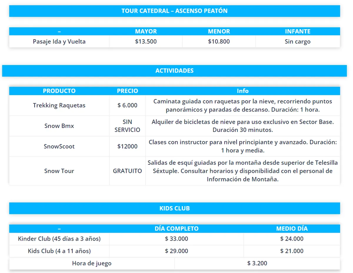- El tour Catedral con ascenso por la Telecabina Amancay, Cable Carril u otros medios de elevación habilitados, el pasaje ida y vuelta cuesta $13.500 (mayores), $10.800 (menores) mientras que de 0 a 5 años acceden sin cargo.