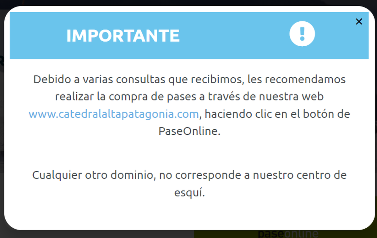 Para adquirir los pases se pueden comprar en boletería en el mismo Cerro o bien ingresar en www.catedralaltapatagonia.com y seleccionar la opción PaseOnline. No ingresar a otras URL dado que se trata de fraudes o estafas.