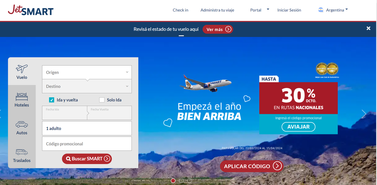 Para obtener el descuento se debe ingresar el código promocional AVIAJAR. Ya sea ingresando a la web oficial (jetsmart.com.ar) y haciendo clic sobre el código que aparece en pantalla o bien en la opción Código Promocional escribir el código para validarlo.