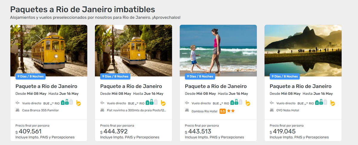 Todos los paquetes son de 9 días y 8 noches, en Río de Janeiro. Se trata de vuelos directos por Flybondi (con bolso y Carrión incluidos), desde el miércoles 8 de mayo hasta el jueves 16 de mayo. Lo que los diferencia son los hoteles, que hacen variar los precios que van desde los $410.000 a $444.00. Por ejemplo: