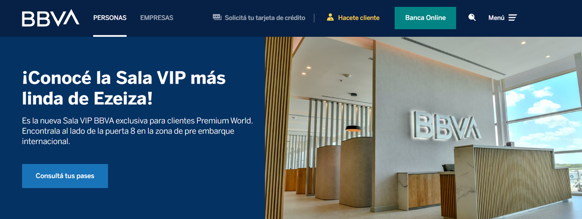 La mayoría de los bancos ofrecen beneficios para sus clientes. Uno de ellos es el BBVA que inauguró una de las salas más grandes en el Aeropuerto Internacional de Ezeiza en Buenos Aires a principios de este 2024.