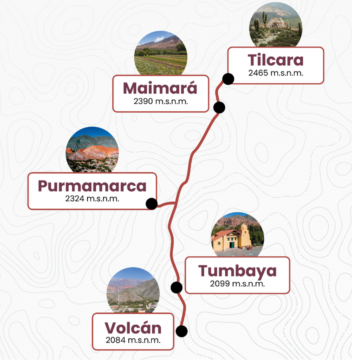 Realiza sus paradas en 5 estaciones: Volcán, Tumbaya, Purmamarca, Maimará y Tilcara, a través de la Quebrada de Humahuaca. En cada una de las estaciones uno puede bajar y recorrer los pintorescos pueblitos con ferias de artesanos que ofrecen productos regionales.