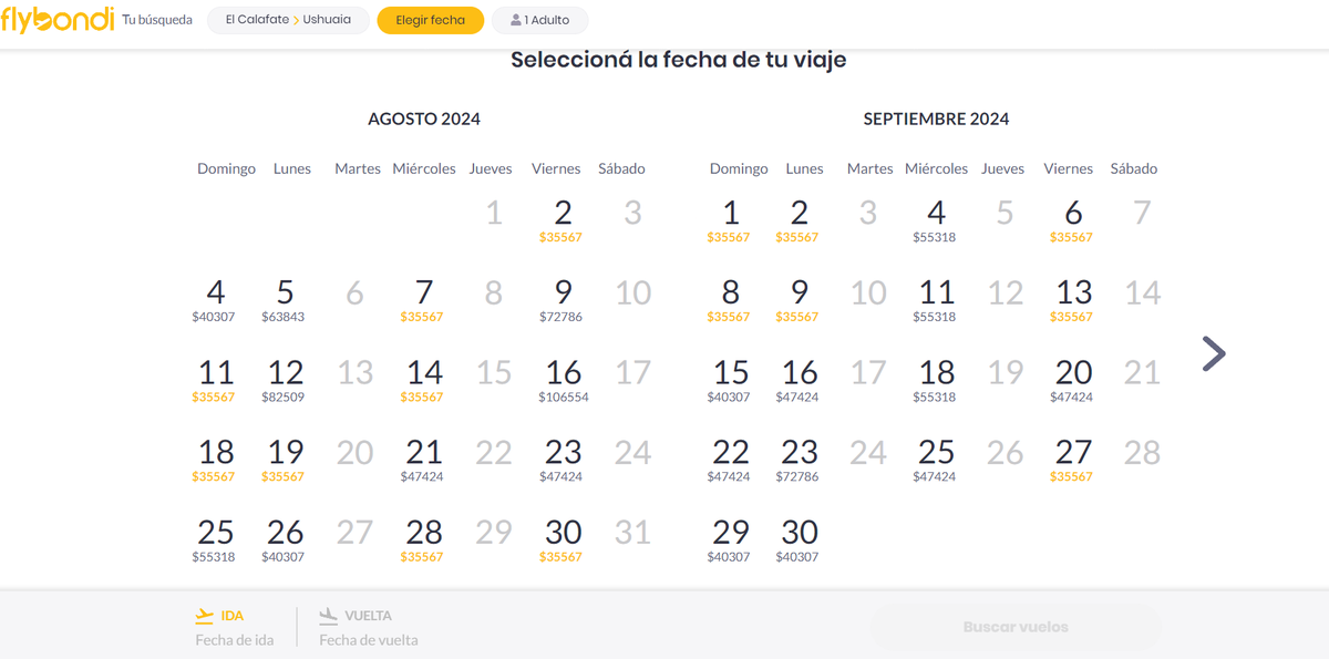 Para obtenerlos se debe acceder a la web de Flybondi (flybondi.com) y desde allí seleccionar la opción de vuelos El Calafate - Ushuaia ida y vuelta o viceversa. Luego, se podrán ver todas las fechas disponibles y sus precios.